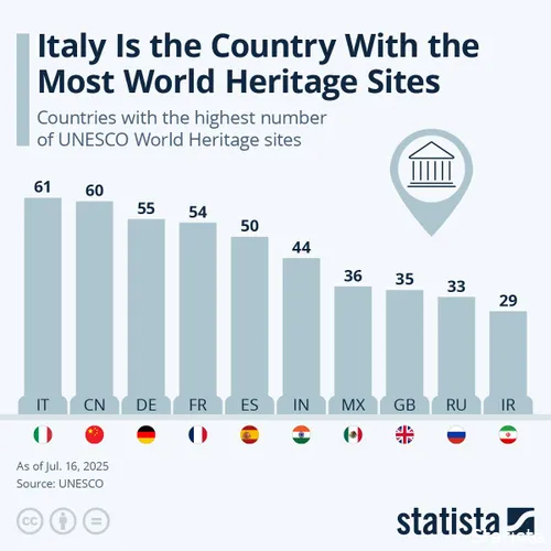 Frankrijk (54 sites) en Spanje (50) maken de top vijf compleet. Frankrijk kreeg dit jaar onder meer de megalieten van Carnac op de lijst, een indrukwekkend prehistorisch landschap aan de Bretonse kust.