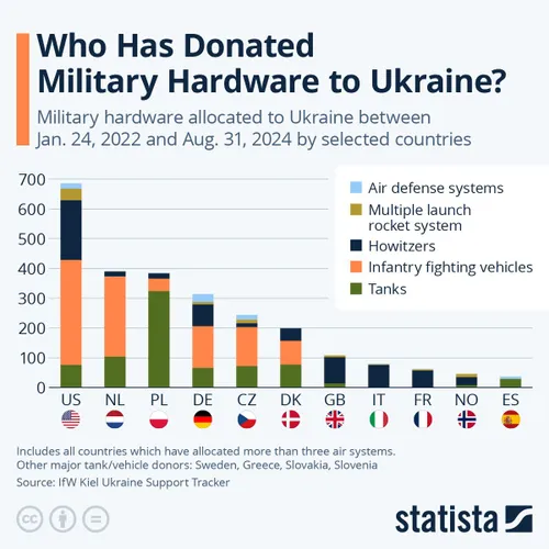 Nederland, Polen en Duitsland hebben elk tussen de driehonderd en vierhonderd eenheden geleverd. Polen richt zich daarbij vooral op tanks, Nederland op voertuigen, en Duitsland op een mix van donaties.