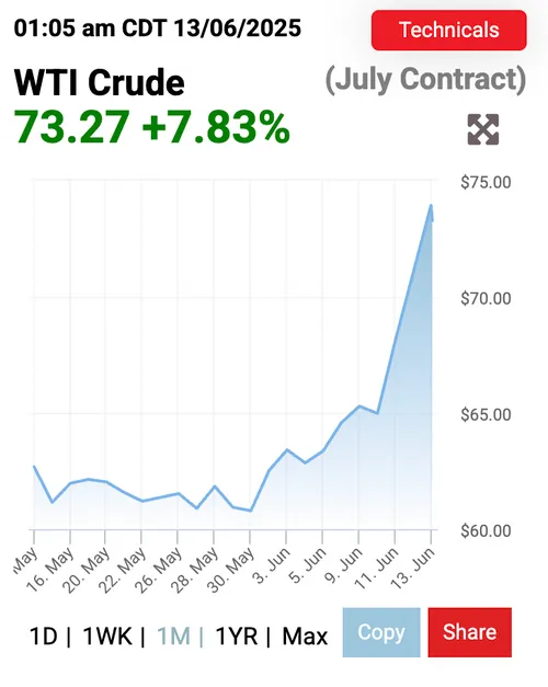 De Israëlische aanval vergroot de spanningen in het Midden-Oosten en voedt de angst voor een breder conflict in de regio, die goed is voor een derde van de wereldwijde productie van ruwe olie. De prijs van een vat Amerikaanse WTI-olie noteerde vrijdagochtend 8,6 procent hoger op bijna 74 dollar. Een vat Brentolie, de olie uit onder meer het Midden-Oosten en de Noordzee, werd 8,3 procent duurder op 75,10 dollar.