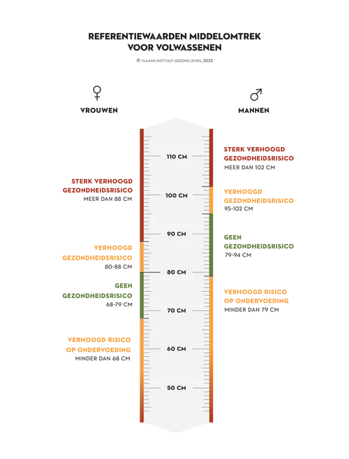 Een gezonde verhouding is een buikomtrek die minder dan de helft van je lengte bedraagt. Voor een persoon van 1,80 meter betekent dit een maximale buikomtrek van 90 centimeter.