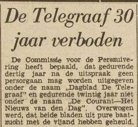 Na de bevrijding kreeg De Telegraaf een verschijningsverbod van dertig jaar opgelegd, omdat de krant onder zware druk had meegewerkt aan de Duitse propaganda. Dat verbod werd na vier jaar alweer opgeheven, mede omdat de samenwerking met de Duitsers vaak onder dwang was gebeurd. Toch bleef het imago van ‘foute krant’ aan De Telegraaf kleven.