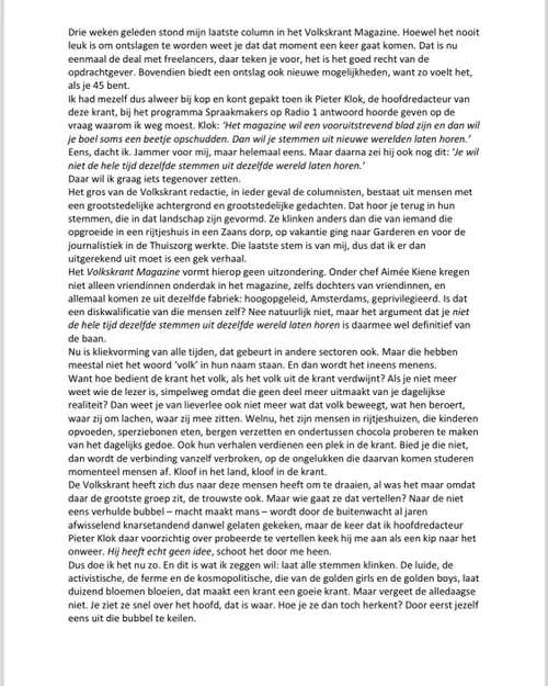 column voor de Volkskrant. Ze beschreef het gesprek waarin haar ontslag werd medegedeeld als een nachtmerrie en bekritiseerde de redactionele leiding voor het gebrek aan duidelijke redenen voor haar ontslag.
