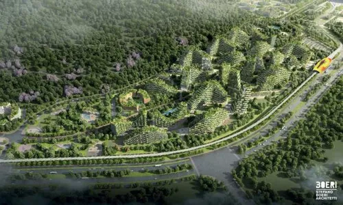 stad bij Liuzhou in de provincie Guangxi. Als het af is kunnen er 30.000 mensen wonen en staan er een miljoen planten en 40.000 bomen. Die worden geplant op de daken en balkons en op elke denkbare plek die vrij is. Het gevolg is dat de stad jaarlijks 10.000 ton CO2 kan absorberen en 57 ton vervuilende stoffen. Ook wordt er 900 ton zuurstof per jaar geproduceerd. Liuzhou Forest City wordt met snelle treinen en