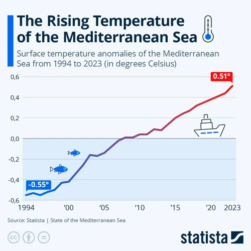 Soms is één simpele lijn in een grafiek zo veelzeggend. Dat geldt ook in dit geval: de temperatuurstijging van de Middellandse Zee sinds 1994 is schokkend om te zien.