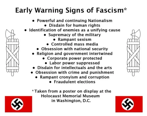 Amerika van Trump veel aandacht krijgt: grote aandacht voor nationalisme minachting voor mensenrechten een gemeenschappelijke vijand om eenheid te scheppen veel macht voor het leger bloeiend seksisme controle over de massa-media obsessie met nationale veiligheid religie en regering met elkaar verweven grote bedrijven worden voorgetrokken vakbonden worden onderdrukt minachting voor intellectuelen en kunstenaars obsessie met