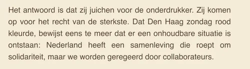 Columniste Karin Amatmoekrim sprak eerder deze week haar verrassende uit over de omvang van de Gaza-demonstratie zondag in Den Haag, terwijl Van der Plas en coalitiepartner Geert Wilders een dag eerder bij het songfestival steunverklaringen voor de Israëlische inzending spraken. "Nederland heeft een samenleving die roept om solidariteit, maar we worden geregeerd door collaborateurs", schreef