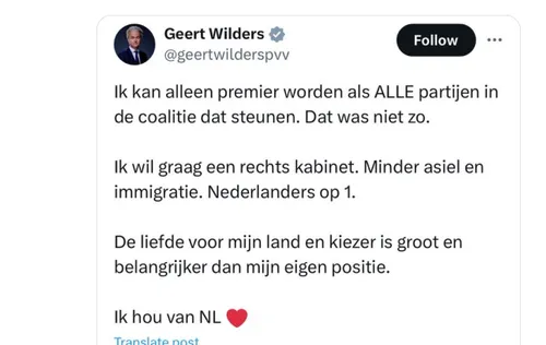 Geert Wilders, geen premier wordt van een nieuw kabinet. Wilders zelf wil daar nog niets over zeggen, maar de andere partijen hebben het als harde eis gesteld om verder te praten, zo bevestigen de bronnen. Ook VVD-leider Yesilgöz, die nu nog demissionair minister van Justitie is, is bereid de Kamer in te gaan.