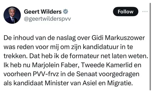 PVV-leider Geert Wilders heeft zijn voordracht ingetrokken. In zijn plaats wordt nu Marjolein Faber minister van Asiel. Faber is nu fractievoorzitter van de PVV in de Eerste Kamer.