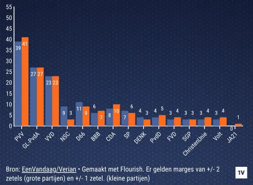 Veruit de grootste verliezer is NSC van Omtzigt. Van de 20 zetels zouden er drie resteren. De PVV groeit een beetje verder ten opzicht van de verkiezingen toen de PVV 37 zetels haalde. Wilders zou nu 41 zetels halen en daarmee royaal de grootste zijn. Maar in het voorjaar stond de partij virtueel op 50 zetels, dus de trend is neerwaarts.