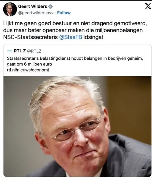 Wilders schaart zich bij een meerderheid in de Tweede Kamer die daar geen genoegen mee neemt. 'Lijkt me geen goed bestuur', sneert hij op X, verwijzend naar de leus waar Idsinga's partij NSC groot mee werd: 'goed bestuur'. Wilders: 'Dus maar beter openbaar maken die miljoenenbelangen!'