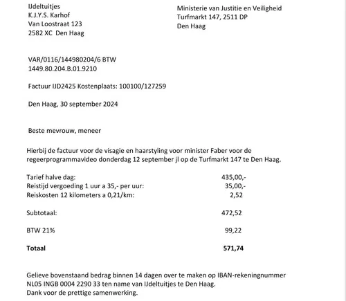 propaganda-video genomen. En daarvoor liet de minister een kapper komen; de gerenommeerde salon 'Ijdeltuitjes'. Zie onderstaande factuur.
