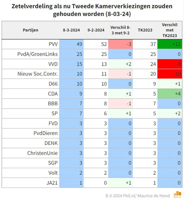 VVD, NSC en BBB waren op 22 november nog goed voor 88 zetels. In de zetelpeiling van Maurice de Hond van 10 maart is dat teruggelopen naar 81 zetels.