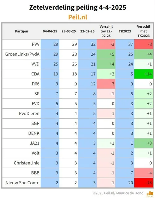 PVV is in zijn glijvlucht omlaag op 29 zetels aangekomen (in januari 2024 waren dat er 50) en GL/PvdA is gestegen naar 29, op de gestage weg omhoog.
