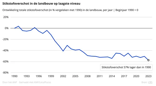 Volgens de laatste cijfers is het overschot inmiddels 57 procent lager dan in 1990. Het grootste deel van die afname werd wel al jaren geleden gerealiseerd. Tien jaar terug stond de afname op 45 procent. Ondanks die afname is volgens onderzoeken van onder meer het RIVM en het Planbureau voor de Leefomgeving nog altijd het grootste deel van de Nederlandse natuurgebieden overbelast met stikstof. De rechtbank bepaalde deze week nog dat de overheid daar te weinig tegen doet en daarmee onrechtmatig handelt.