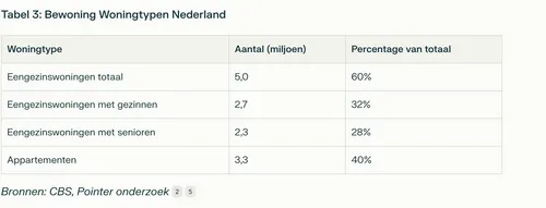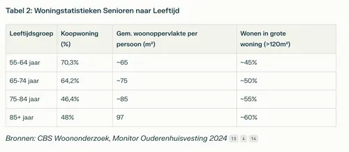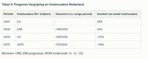 De Nederlandse Vereniging van Makelaars (NVM) benadrukt dat 32% van alle koopwoningen in Nederland eigendom is van 65-plussers. Deze groep verhuist echter relatief weinig, waardoor veel woningen die geschikt zijn voor gezinnen met kinderen bezet blijven door ouderen17.