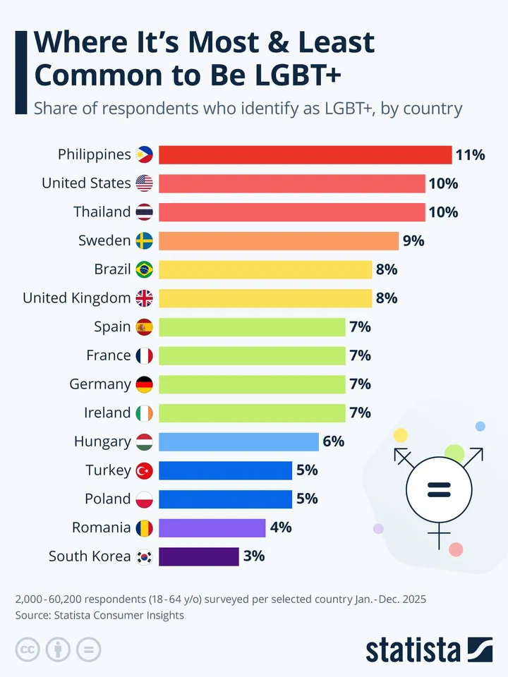 Aan de andere kant van het spectrum staan landen waar relatief weinig mensen zichzelf als lhbti omschrijven. In Zuid-Korea ging het om ongeveer 3 procent van de volwassenen, terwijl in Roemenië zo’n 4 procent die identificatie gebruikte. Zulke verschillen kunnen te maken hebben met cultuur, sociale acceptatie en de mate waarin mensen zich veilig voelen om open te zijn over hun identiteit.
