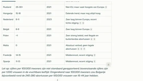 - Oost-Europa: In de jaren '90 en vroege 2000 was het aantal abortussen in Oost-Europa extreem hoog (soms >50 per 1.000 vrouwen), maar is sindsdien fors gedaald door betere anticonceptie en voorlichting. Bulgarije en Roemenië blijven echter hoog scoren.