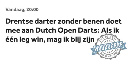 Op de tweede plek stond een bericht op een bekend datingforum: "Oeps! Ik heb iemand gelikt die ik niet wilde liken!" De derde plaats ging naar een nieuwsartikel van RTV Drenthe met de kop: "Drentse darter zonder benen doet mee aan Dutch Open Darts: Als ik één leg win, mag ik blij zijn."