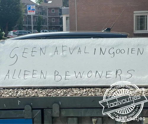 Ook dit jaar heeft de verkiezing 'Taalvout van het jaar' weer een spetterende winnaar opgeleverd: "Geen afval ingooien alleen bewoners", pronkt op een bord boven een afvalcontainer ergens in