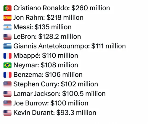 Forbes elk meer dan $100 miljoen - samen een record van $1,38 miljard. Het zijn samengestelde bedragen, deels verdiend op het veld, deels daarbuiten.