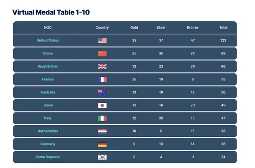 De sporters uit de Verenigde Staten staan bovenaan de virtuele medaillespiegel met 123 medailles, tien meer dan in Tokio. De Amerikanen worden gevolgd door China (89), Groot-Brittannië (66), gastland Frankrijk (55) en Australië (50). De verwachting is dat Amerika het in de strijd om gouden medailles lastig gaat krijgen met China. De Amerikanen zouden volgens de berekeningen 39 keer goud veroveren, China 35.