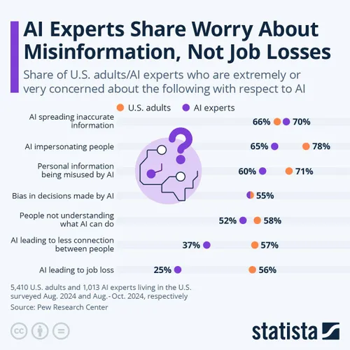 Toch delen experts en het publiek ook zorgen. Zo maken beide groepen zich druk om de verspreiding van onjuiste informatie via AI en over het risico dat AI wordt ingezet om mensen na te doen, denk aan deepfakes. Ook het gebruik (of misbruik) van persoonlijke gegevens en vooroordelen in AI-gestuurde beslissingen worden door beide groepen als serieuze risico’s gezien.